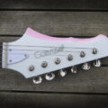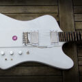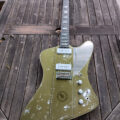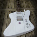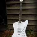 The obvious feature here is a 2-post floating trem, and a base/pure white colour. With extremely light-weight woods (cedrela in the main) this one weighs in at 6lbs 1oz which is very light for a Firebird-type guitar.